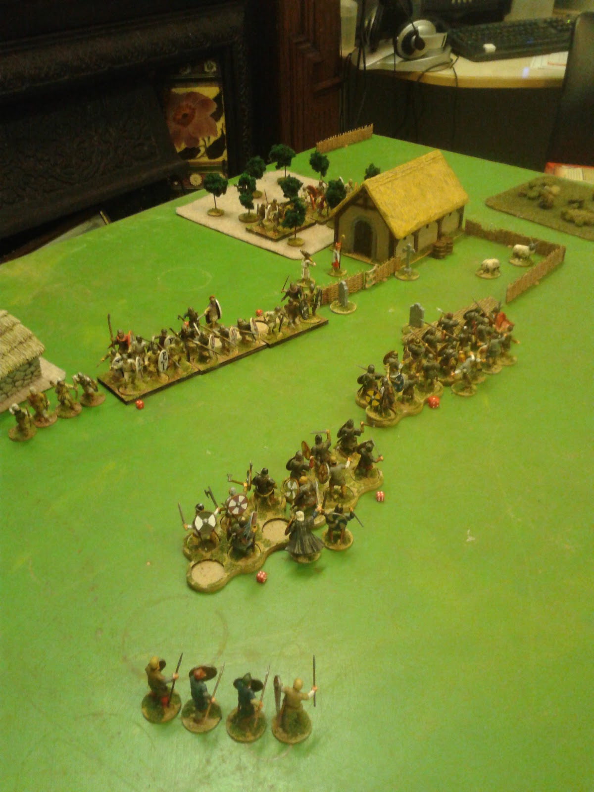 The Saxons had 3 turns of movement before any Britons would arrive. This got them half way up the table, heading straight for the church. Oswald on the left, then Aelfwald and Aella on the right.